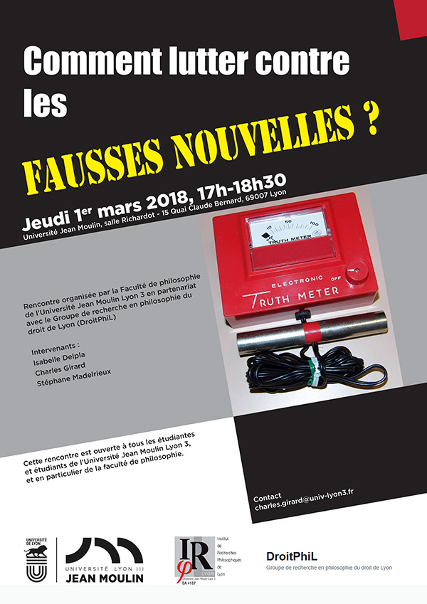 La Faculté de philosophie organise une rencontre entre étudiants et enseignants pour débattre ensemble du problème posé par la désinformation en démocratie. Les fake news sont soupçonnées d’avoir joué – ou dans certains cas manqué de jouer malgré un effort concerté de certains acteurs – un rôle crucial dans plusieurs élections récentes. Le président de la République française a récemment annoncé la préparation d’un projet de loi pour les combattre plus fermement, alors même que la loi sur la presse de 1881 punit déjà la diffusion de nouvelles fausses. Tout effort de réglementation juridique en la matière soulève pourtant un problème redoutable : celui du juste équilibre entre protection du droit à la libre expression et de la liberté de la presse, d’une part, et réglementation nécessaire de la communication publique, de l’autre.