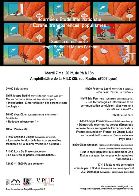 - 9h15 : Jacopo Bodini (Université Jean Moulin Lyon 3) – Mauro Carbone (Université Jean Moulin Lyon 3), "Introduction : L’intériorisation des écrans et son idéologie"