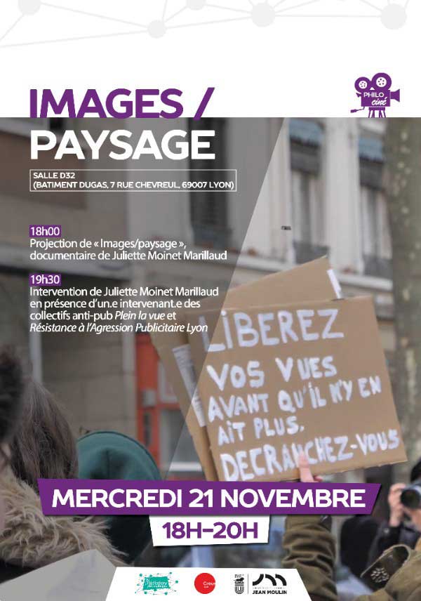 - 19h30 : Intervention de Juliette Moinet Marillaud, étudiante en Master 2 Cinéma et Audiovisuel à l'Université Lumière Lyon 2. En présence de bénévoles des collectifs anti-pub Plein la vue et Résistance à l'Agression Publicitaire Lyon.